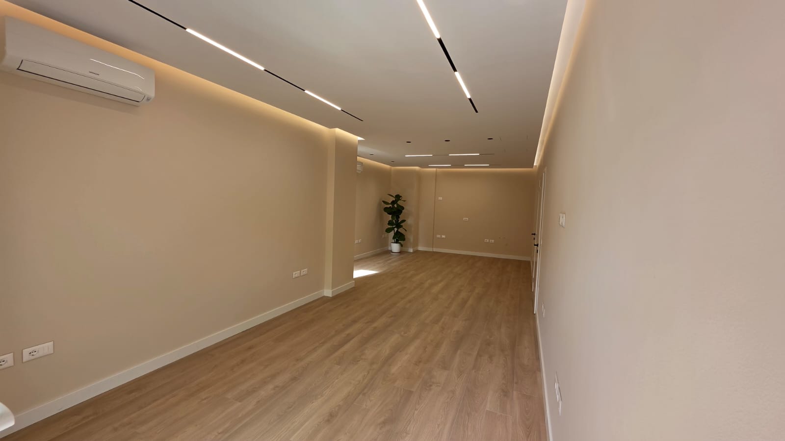 • Ambjenti ka (Tavan i varur me ndricim perimetral /4 Kondicioner HTC 12 Btu/ Parket Kronotex 1.2 cm/ Vetratat Veka)
