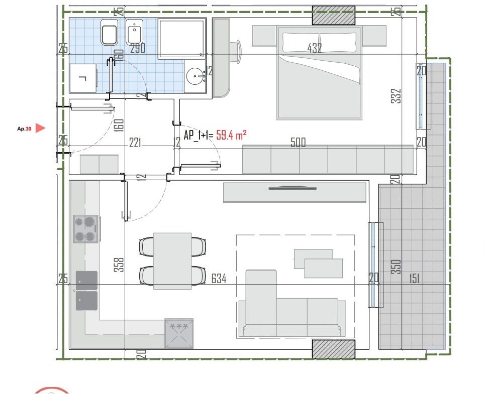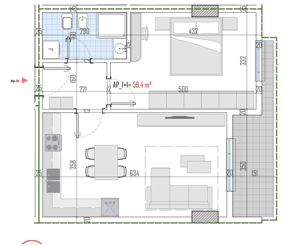 - Siperfaqe neto: 59.40 m2.