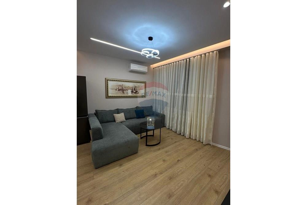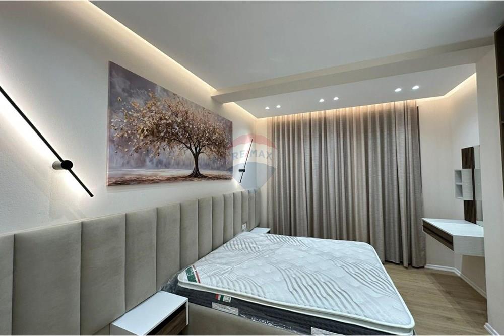 Apartamenti ka nje siperfaqe totale prej 104 m2 dhe eshte i organizuar ne menyre funksionale me sallon te bollshem, ambient gatimi, dy dhoma gjumi dhe tualet. Ofrohet i mobiluar ne menyre moderne dhe komode, me te gjitha kushtet per nje jetese rehate.