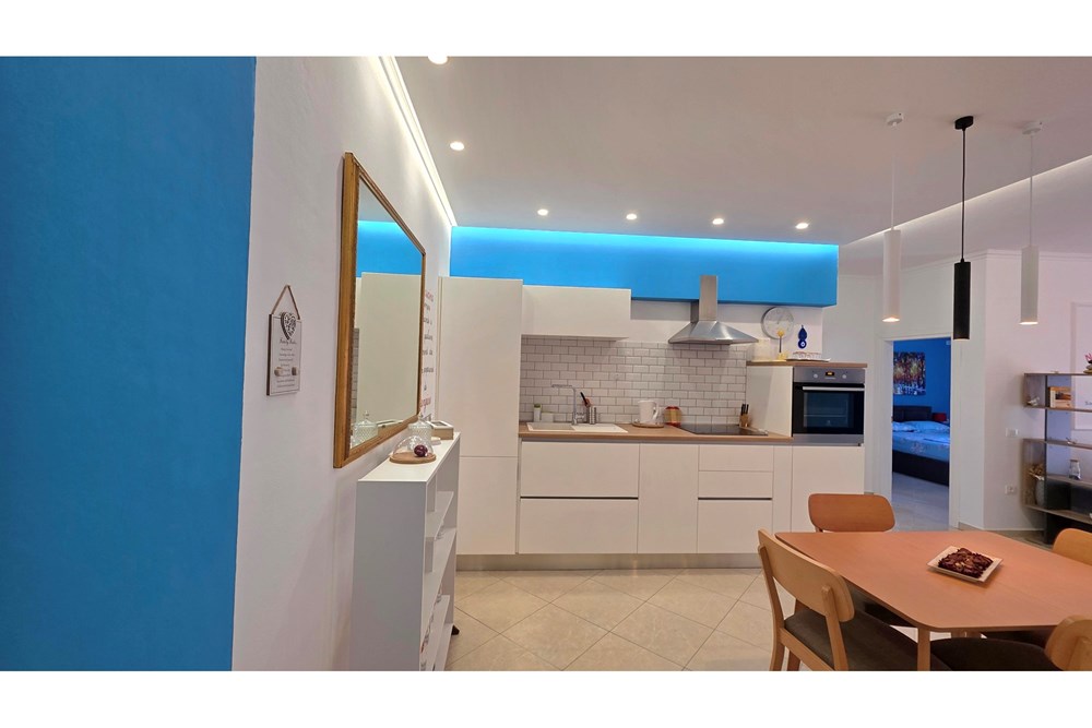 Sallon i bollshëm me kuzhinë moderne dhe dalje në ballkon me pamje panoramike nga deti