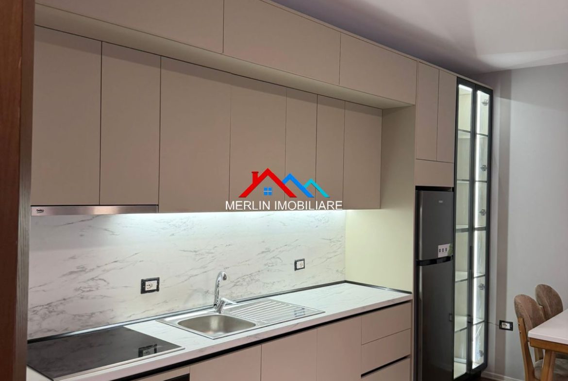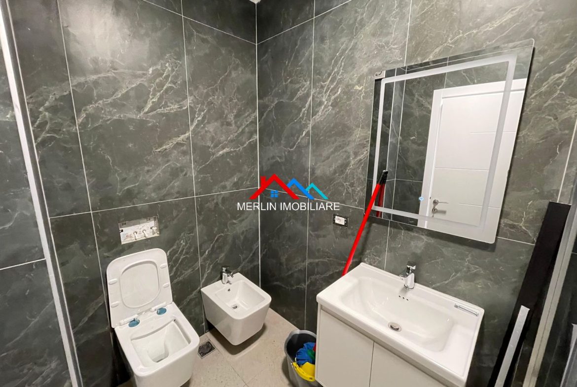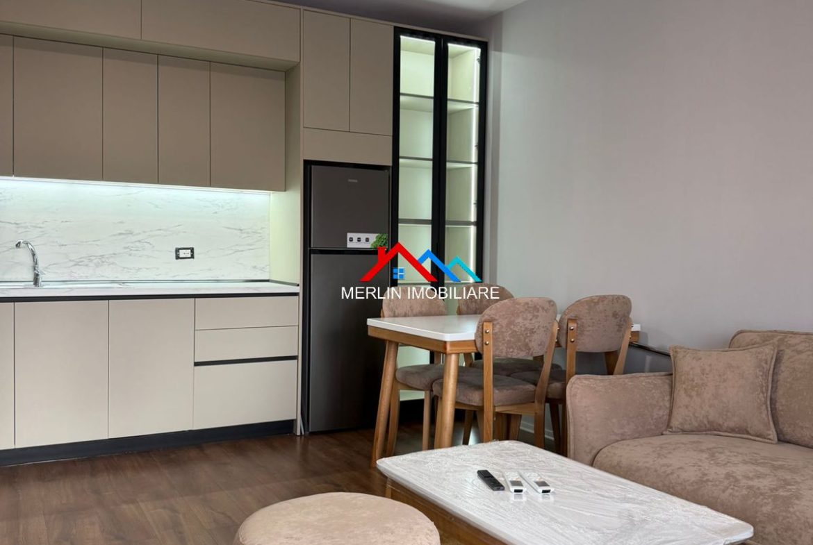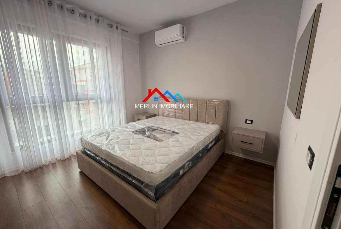 Jepet Apartament 1+1 me qera afer Bulevardit te Ri,ne rrugen Filip Jano. Apartamenti ka nje siperfaqe 70m2 dhe ndodhet ne katin e 5 te nje pallati te ri me ashensor. Apartamenti eshte totalisht i mobiluar bukur,i pa banuar me pare dhe eshte i perbere nga nje dhome gjumi,nje ambjent gatimi bashke me ambjentin e ndenjes,nje tualet e nje ballkon. Ai eshte i pajisur me kondicioner dhe i shtruar me parket.