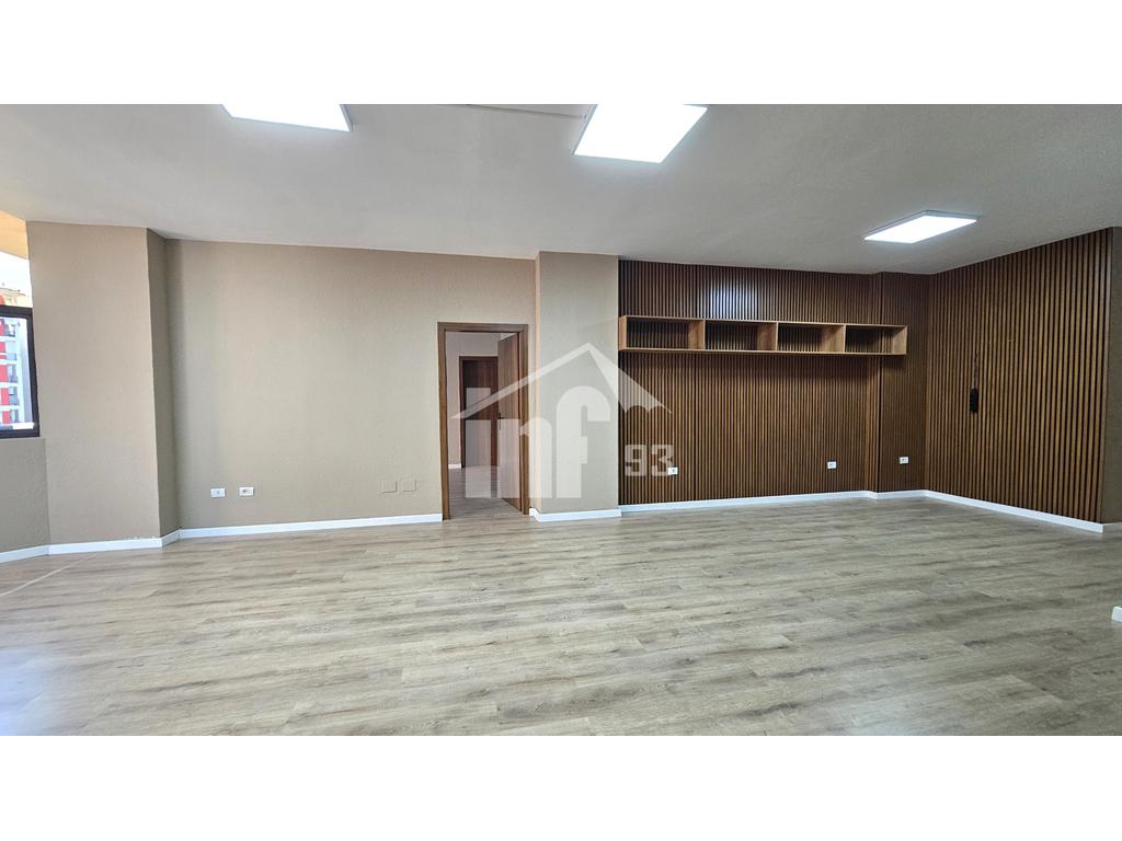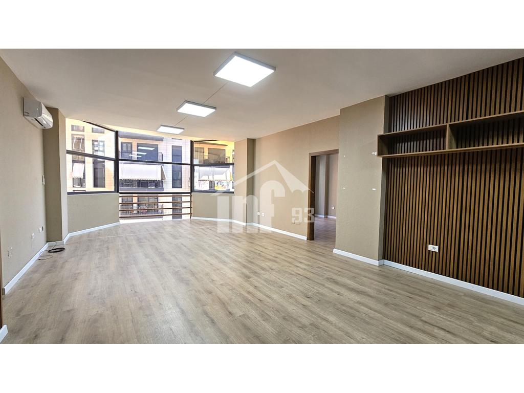 Zyrë me qira me sipërfaqe 126 m2 neto, kati 6-të dhe me pamje shumë të bukur të zonës përreth. Ështe e organizuar në 3 ambiente pune, 2 tualete, korridor, depo dhe 2 ballkone. Ambienti jepet i pa mobiluar. Ka të instaluar ajër të kondicionuar, ndriçim tavanor etj.