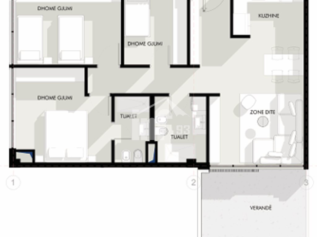 Apartament në shitje 3+1 me sipërfaqe neto 99.3 m2 (111.8 m2 bruto) + 17.9 m2 verandë, kati përdhe, me orientim jug- lindje. Përbëhet nga dhomë ndenje + kuzhinë + ngrënie, dhomë matrimoniale + tualet, 2 dhoma gjumi, tualeti dhe veranda.