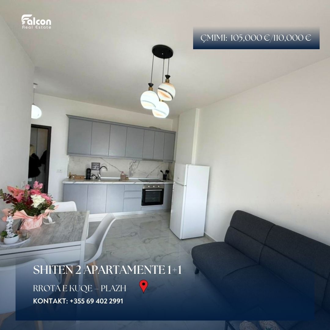 Shiten dy apartamente 1+1 në zonën e Rrotës së Kuqe, Plazh, të pozicionuara në katin e 6-të të një pallati me ashensor. Të dyja pronat kanë organizim funksional dhe ofrojnë pamje nga deti, duke i bërë ideale si për pushime ashtu edhe për investim.