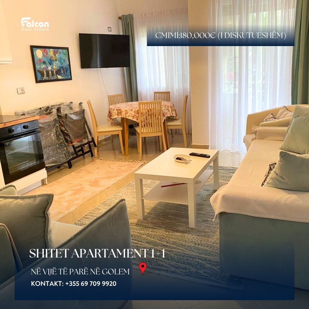 Shitet apartament 1+1 në vijë të parë, me një sipërfaqe totale prej 65 m². Apartamenti ndodhet në katin e dytë të një pallati të pajisur me ashensor dhe ofron pamje anësore nga deti. Ai shitet plotësisht i mobiluar dhe është i përshtatshëm si për banim, ashtu edhe për investim.Zona në të cilën ndodhet është ndër më të preferuarat në Golem, shumë pranë bregdetit dhe me akses të lehtë në çdo shërbim.