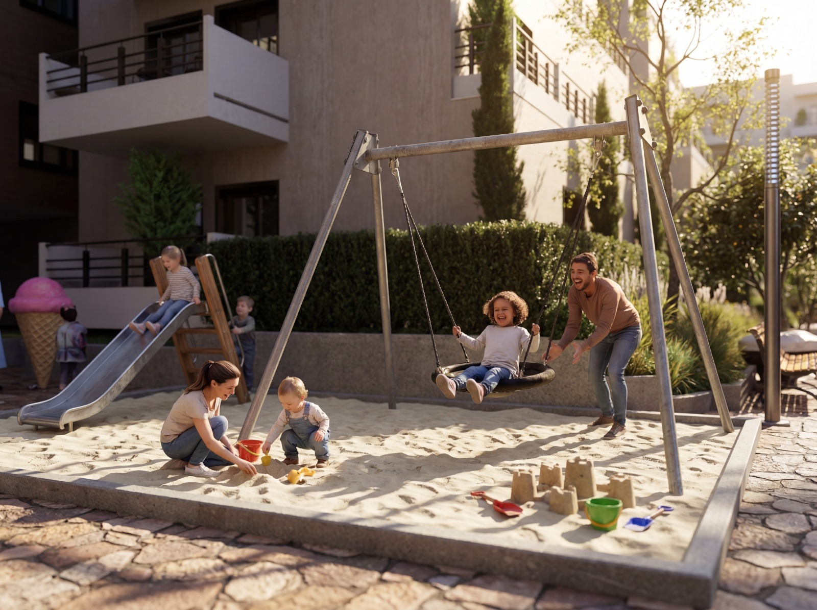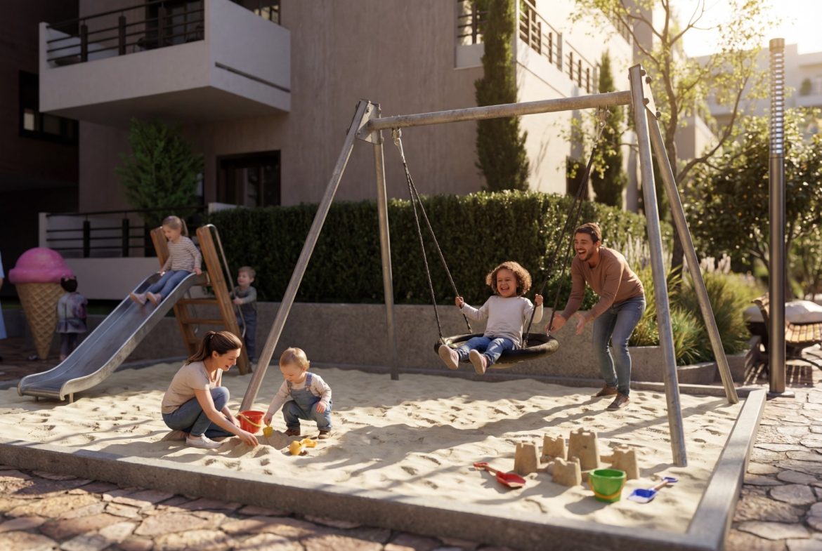 Apartamenti ndodhet në një objekt modern me fasadë të ventiluar, që siguron izolim termik dhe akustik më të mirë, si dhe një standard të lartë ndërtimi.