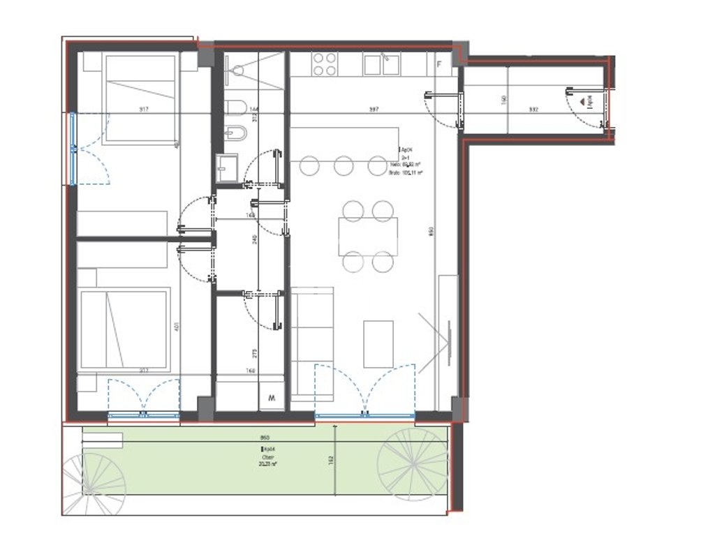 Apartament në shitje 2+1 me sipërfaqe neto 90 m2 (106 m2 bruto) + 21m2 verandë, kati përdhe. Organizohet nga ambient ndenje + kuzhinë + ngrënie, 2 dhoma gjumi, veranda, korridor dhe 2 tualete.