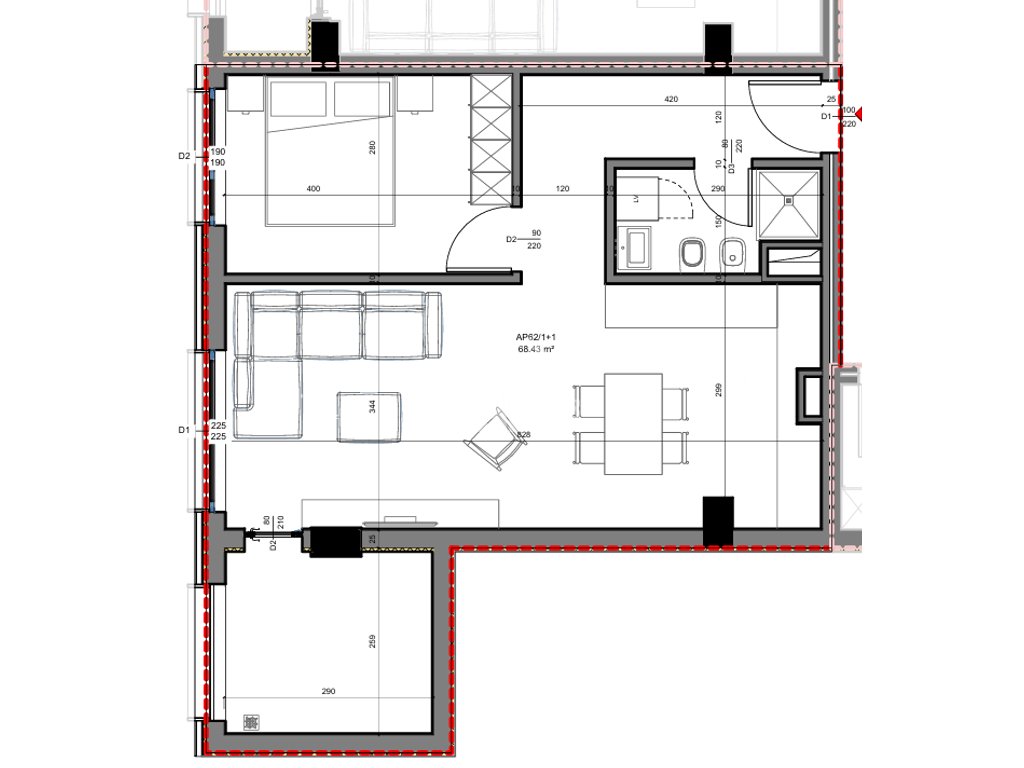 Apartament 1+1 në shitje, me sipërfaqe neto 68.43 m2 (bruto 77.8 m2), kati i 8-të, me orientim jug-perëndim. Organizohet nga ambient ndenje + gatim + ngrënie, dhomë gjumi, tualet dhe ballkon.