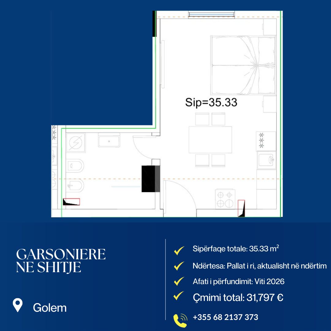 🏢 Shitet Garsoniere – Golem ,Investim Ideal në Ndërtim të Ri (Përfundon në 2026)