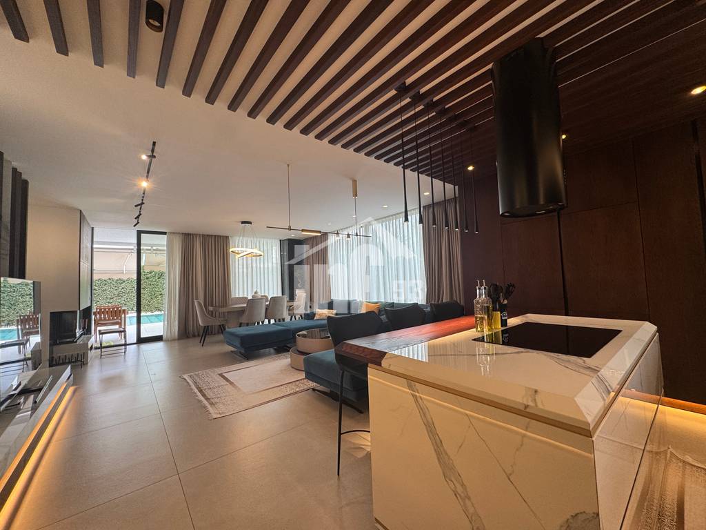 Vilë e bashkangjitur 2 katëshe në shitje me sipërfaqe ndërtimi totale 160.2 m2 + sipërfaqe verande 17.6 m2 + sipërfaqe trualli 660 m2, me orientim veri-jug-perëndim. Kati përdhe organizohet nga ambient ndenje + gatimi + ngrënie, tualet, depo dhe verandë. Kati i 1-rë organizohet nga 3 dhoma gjumi, 1 tualet, verandë e gjelbëruar dhe lavanderi. Vila disponon dhe një pishinë me dimensione 11 me 4.5 dhe 1.4 M thellësi. Pishina është me ngrohje dhe me kripë. Ka dhe dush të jashtëm.