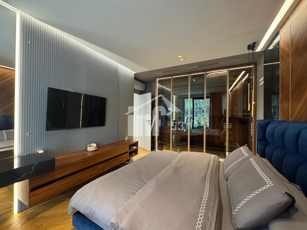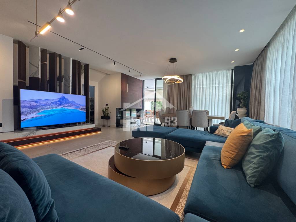 Vila është projektuar e gjitha me arkitekt të dedikuar, ndërtimi është bërë nga pronari dhe nuk janë përdorur materiale nga kompania e ndërtimit. Oborri ështe i shtruar me pllaka dhe me bar tapet, është i rrethuar me gjelbërim, me pisha të larta, pemë ulliri dhe lloje të tjera, ka sistem vaditje, ndricim të jashtëm dhe sistem kamerash. Në oborr ndodhet dhe një ambient me dru dhe përdoret për kuzhinë të jashtme dhe depo. Në katin përdhe ambienti është i shtruar me pllaka cilësore nga Brunesi. Kuzhina dhe dyert e brendshme janë me material MDF cilësor Italian. Ishulli tek kuzhina dhe vendi ku ndodhet TV 75 polsh janë shtruar me pllaka shumë cilësore nga kompania Format Plus. Perdet janë të markave më të mira. Dhomat e gjumit janë te shtruara me parket druri, ka sistem ngrohje-ftohje Multisplit Mitsubishi, sistem ndriçimi me spote dhe shina. Oxhaku i drurit është i një marke shumë cilësore Franceze. Tualetet janë me lavamanë të personalizuar nga Format Plus, hidrosanitare Italiane dhe pllakat nga Brunes. Elektroshtëpiaket cilësore të markës Gjermane AEG. Kolltuqet janë të bëra me porosi. Veranda në katin e 1-rë është e gjelbëruar dhe me tendë elektrike me ndriçim dhe tavolina e jashtme është e përbërë me dru Italian.